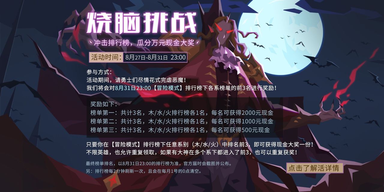 活动期间,请勇士们尽情花式完虐恶魔!我们将会对8月31日23:00【冒险模式】排行榜下各系榜单的前3名进行奖励。