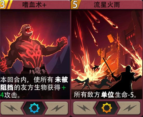 主动技能直接创造进攻的机会,采用各种法术牌进行场面的压制,例如:连珠火球、无尽烈焰、流星火雨;