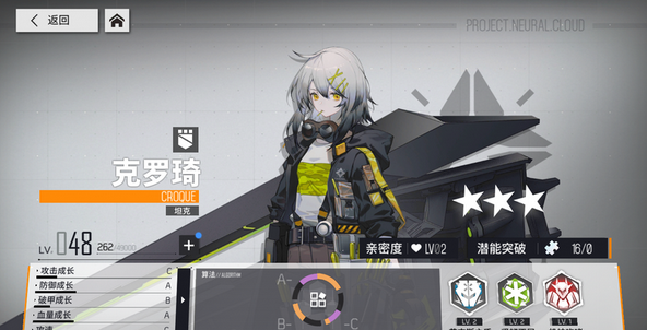 评价:主动技能嘲讽可以拉开攻击后排的敌人或者重新让敌人索敌(游戏攻击索敌判定都是优先攻击最近单位,除非吃到格子或者技能效果),嘲讽期间敌人只能攻击克洛琦,这段时间即使在敌人面前有其他可攻击单位也不会进行攻击,被卡住无法攻击到克洛琦的敌人会傻傻站在原地(相当于除了克洛琦以外,其他人形都变得无法被锁定),是游戏中二测里最实用的技能(虽然一场战斗只能用一次)。被动可按百分比为自己回血,技能提升后能额外提供防御。面板属性肉度目前游戏里(二测)最肉。