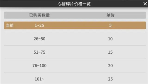 玩家可以通过不等数量的心智构件来购买心智碎片,一般最开始是5心智构件来兑换,超过25以后就会涨价,详情见下: