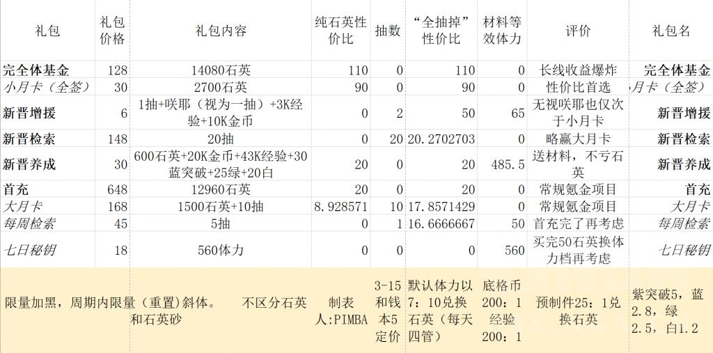 以及氪度不同,体力价格价值不同,表中体力价格是按中重氪算的(每天四管均价)