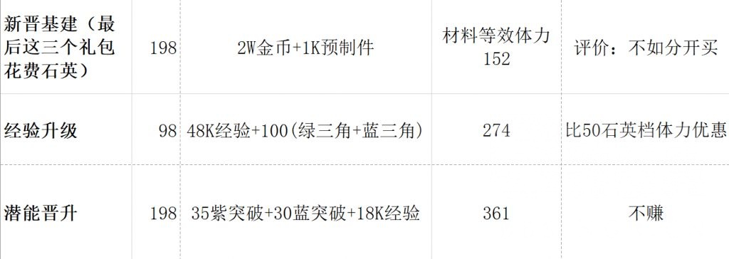 故图中的所有涉及体力和养成材料的礼包,对不同的玩家价值会有较大波动,仅供参考