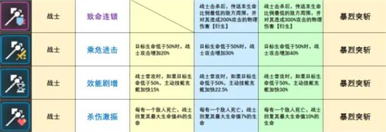 乘危进击: 目标生命低于50%时,战士攻击增加20%。敌弱我强的函数,提升也算明显,面对敌方有治疗单位的时候收益会低一些,因为更难打进50%血线。打BOSS的话收益会比较高,如果队伍里战士多可以拿。升级提升不大,不建议升。