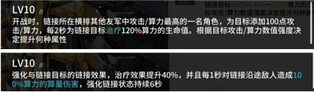 角色技能为开场链接一个队友提供持续BUFF,10级提供100点面板,对于满级主C来说输出提升不足10%。