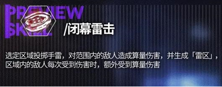 向目标区域投掷手雷,对7格范围内所有敌方造成100%算力的算量伤害,并留下持续5秒的「雷区」