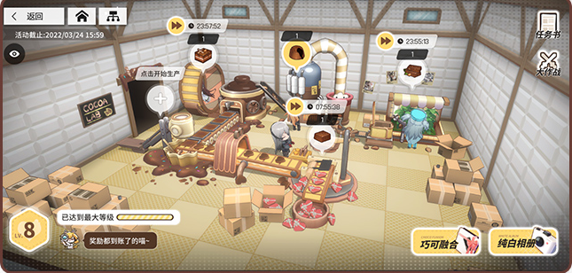 在“满心可可屋”中,教授可以选择想要制作的巧克力或显影可可粉,开始制作前需要选择位人形协助。制作需要等待定的时间,教授可以使用[速效卡]加速制作。每完成一次制作,都可以获得对应的制作经验,用于提升制作等级、解锁更多的制作装置以及新的制作订单,还会立刻获得某些活动道具。