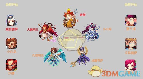阵容特点:观音菩萨算是加强版的小白龙,普通攻击有几率增加自身的怒气,可以更快释放偷怒技能,而且观音的进阶光环比小白龙好上太多,增加了命中属性之后,观音偷怒技能比小白龙成功率更高。配合上唐僧和大鹏的机制,佛家属于越战越勇的类型。