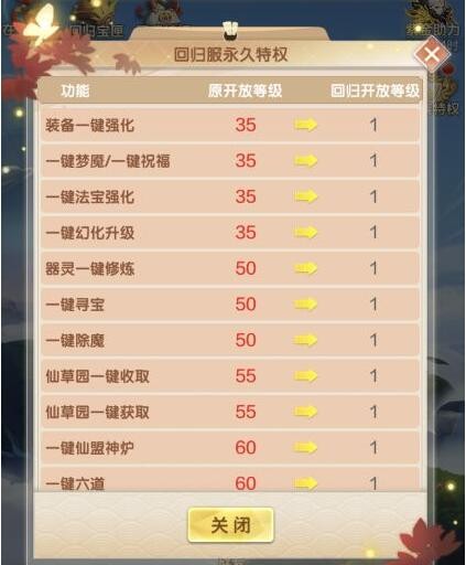 4、部分一键功能将提前开放,以下功能全部提前到1级开启