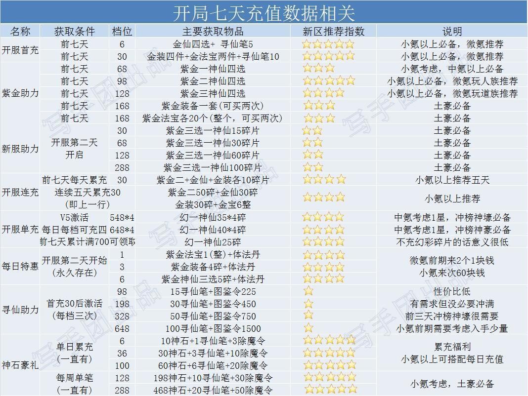 星晴大佬去年做的这张图还能看,不过毕竟是去年幻彩版本做的,现在都青曜版本了,这些推荐指数除了每日特惠和新服助力要加1星,神石壕礼不变,其他都得减1星。新区充值活动有以下四个变动,其他都跟现在一样。