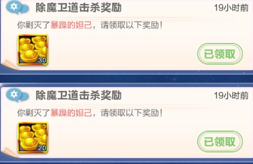 对妖怪造成的伤害会换算成一定比例的功勋,每天累计功勋达到一定层次可以领取奖励,包括法宝经验、元灵、银两、除魔令,奖励丰厚,记得每天都要来除魔积攒功勋~,在击杀完妖怪后,还可以在邮件处领取相应的击杀奖励,这个可是真金白银的元宝啊