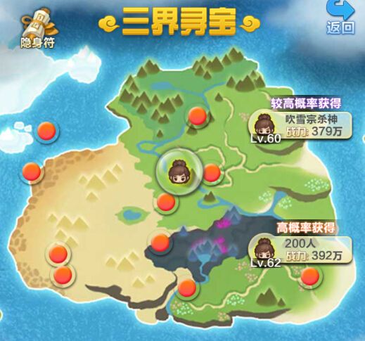 红点为较低概率获得,抢夺玩家则为较高概率、高概率及必定获得,每次寻宝消耗2点法力。