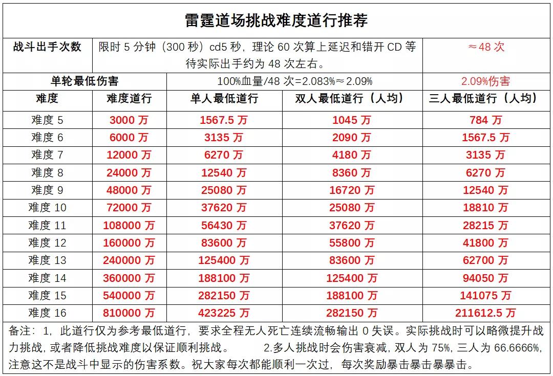 雷霆道场的最低道行要求表如下:(理论队伍每下伤害总和不得低于2.09%)