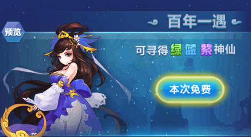 百年一遇可寻得绿,蓝,紫三种品质神仙。每日有三次免费机会,可消耗请神符来进行寻仙。