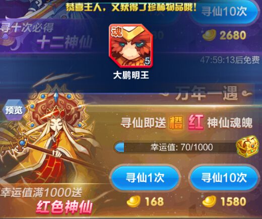 每次寻仙消耗168元宝,10连抽消耗1580元宝,随机获得大量橙,红神仙魂魄。