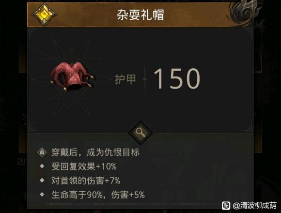 至高之庭获得的小丑帽子,可以使穿戴者称为仇恨目标,配合特殊职业,能发挥很好效果。