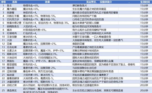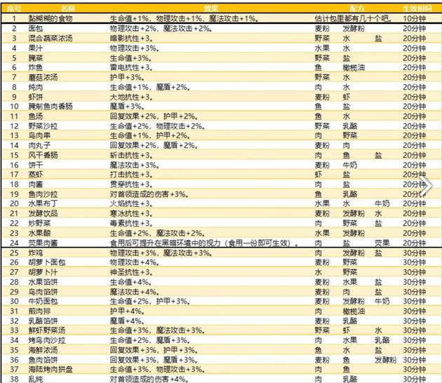 凭借自己多年的烹调经验~整理了现阶段能做的和能获取到的食物的效果、配方、以及生效时间这些~