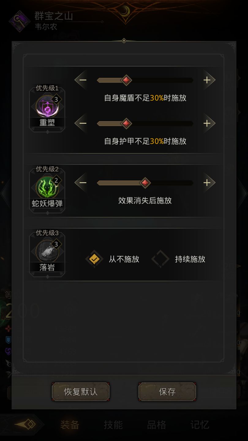 1、群宝装备***条选择:行动间隔+异常时间+首领伤害+护甲大于X增加伤害。