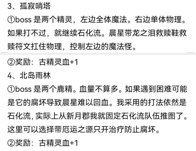 4、孤寂哨塔。boss是两个精灵,左边全体魔法。右边单体物理。如果打不过,就继续石化流。晨星带龙之泪救赎鞋救赎符文扛住物理,控制左边的魔法怪。奖励:古精灵血+1