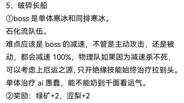 6、破碎长船,boss是单体寒冰和同排寒冰,石化流队伍。难点应该是boss的减速,不管是主动攻击,还是被动,都会减速100%,物理队如果因为减速杀不死,可以考虑上厄运之源,只开绝缘技能始终治疗拉到头。单体治疗ai愚蠢,能不能奶到千面看运气。