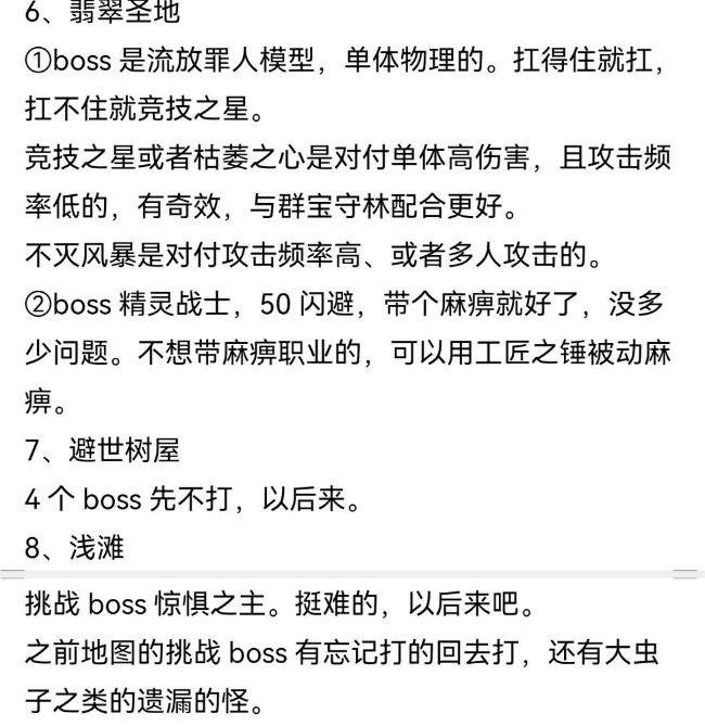 7、翡翠圣地。①boss是流放罪人模型,单体物理的。扛得住就扛,扛不住就竞技之星。竞技之星或者枯萎之心是对付单体高伤害,且攻击频率低的,有奇效,与群宝守林配合更好。不灭风暴是对付攻击频率高、或者多人攻击的。