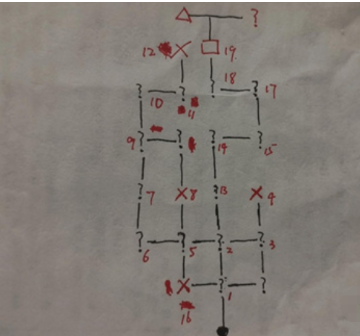 1.如图,黑点是起点,红叉是怪,黑色问号是扣血点,一次扣百分之三十