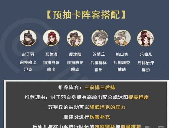 2、预抽卡阵容搭配:封子羽+耶律炎+虞沐阳+苏望丘+桃山客+乐仙儿