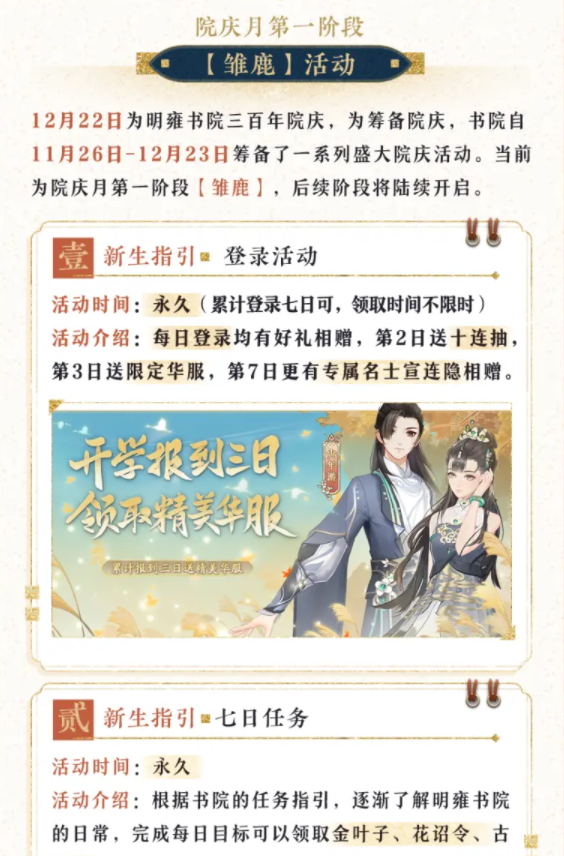 明雍书院三百年院庆月活动共分为四个阶段:【雏鹿】、【开幕】、【同窗】和【百年】。