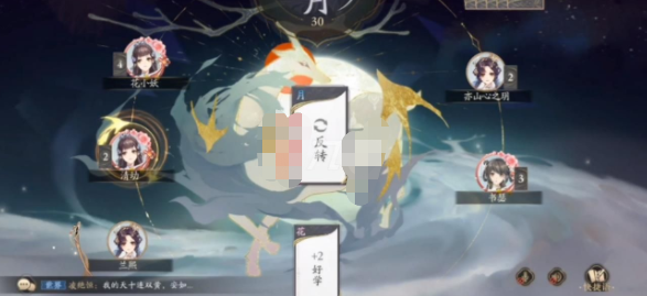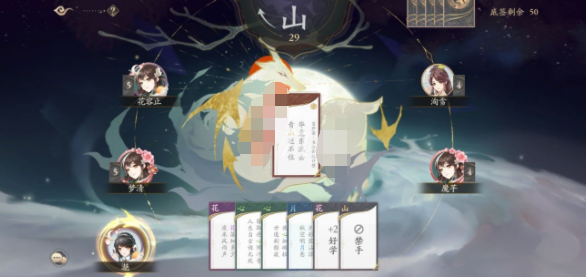 如果小伙伴们之前玩过uno牌的话,那么这个飞花令活动就可以直接上手了,两者的玩法是差不多的,飞花令就相当于简单版的uno牌。在该玩法中,小伙伴们一共会拿到“山、月、心、花”4种基础字牌,以及三种功能牌——跳牌、发牌以及逆转牌,其中跳牌可以不让下家出牌,罚牌可以让牌数量+2,逆转牌则是将出牌顺序反过来。