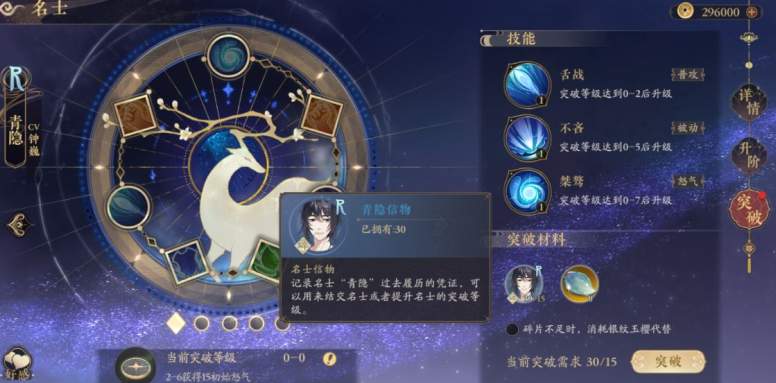 1、名士进行突破首先需要达到当前的等级上限,之后需要消耗一定数量的名士信物,或者稀有材料「银纹玉樱」