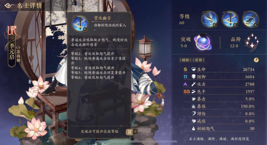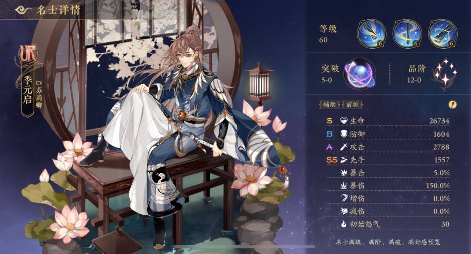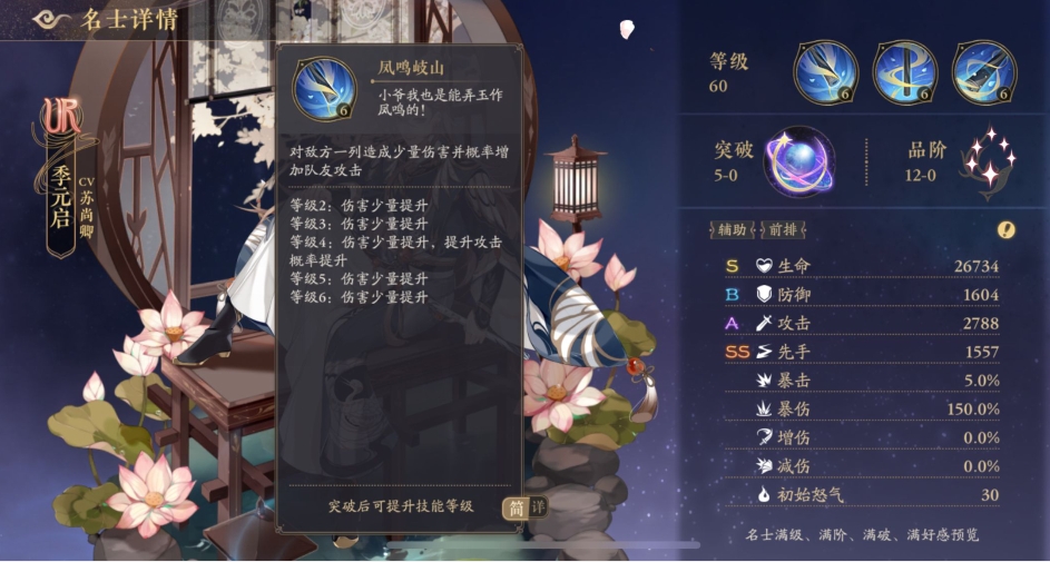 鼓鸣:在鼓鸣状态下使用怒气技能时,提升全体队友10点怒气,回复全体名士季元启攻击力50%的生命并提升全体名士10%伤害,持续2回合,无法驱散。