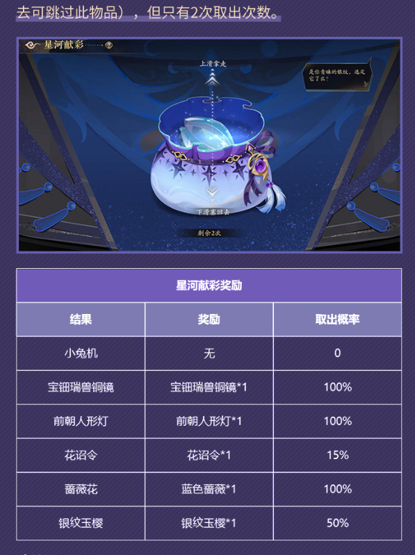 【星河献彩】:类似于抽奖,可获得花诏令、银纹玉樱、好感度礼物等,对应吉星牌可刷动物闪秀+千面幻影关卡