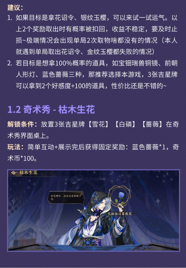 【枯木生花】:简单互动,获得固定奖励蓝色蔷薇1+奇术币100,对应吉星牌可刷动物闪秀+四季亭关卡