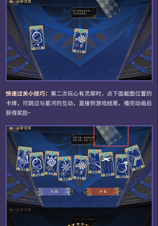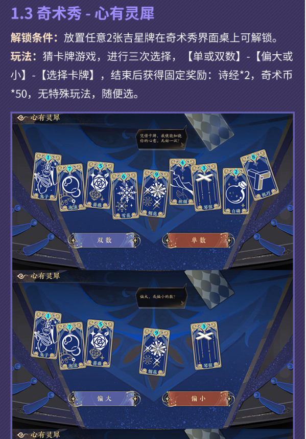 【心有灵犀】:猜卡牌(更多是互动)获得固定奖励诗经2+奇术币50,对应吉星牌刷任意关卡即可