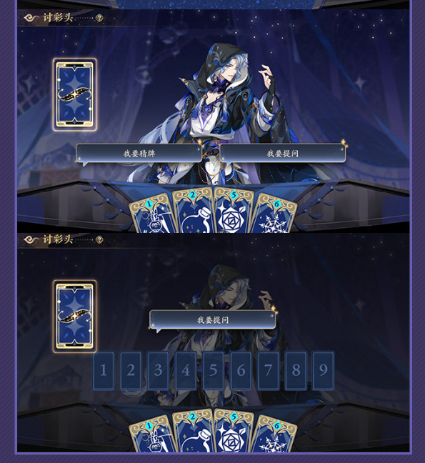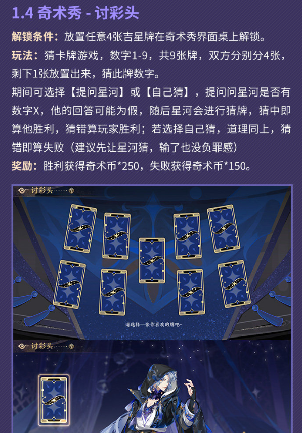 【讨彩头】:猜卡牌(需略加思考,可选猜或被猜)胜利奇术币250,失败奇术币150,对应吉星牌刷任意关卡即可