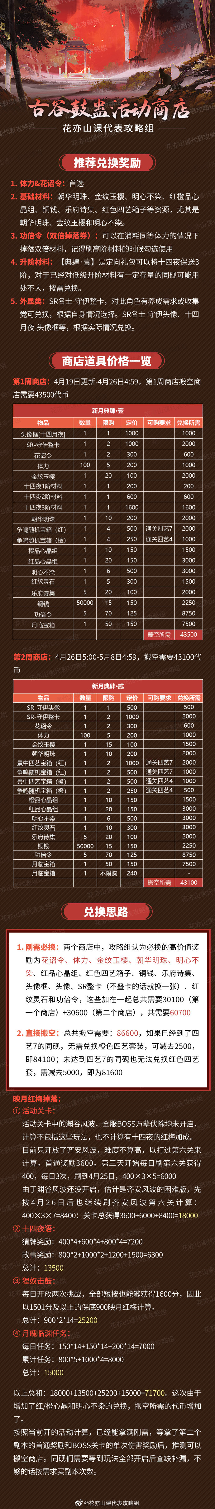 ③古谷鼓蛊活动产出映月红梅56700,加上月魄临渊的15000,可以获得71700映月红梅