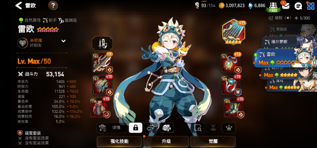 2、雷欧装备属性需要提升速度命中、速度暴击属性,神器建议选择【星辰之歌】或者是【无限提篮】