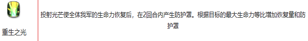投射光芒使全体我军的生命力恢复后,在2回合内产生防护罩。根据目标的最大生命力等比增加恢复量和防护罩;
