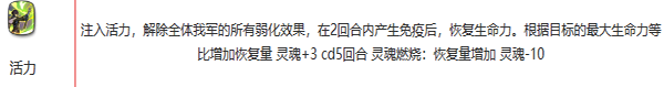 注入活力,解除全体我军的所有弱化效果,在2回合内产生免疫后,恢复生命力。根据目标的最大生命力等比增加恢复量 灵魂+3 cd5回合 灵魂燃烧:恢复量增加 灵魂-10;
