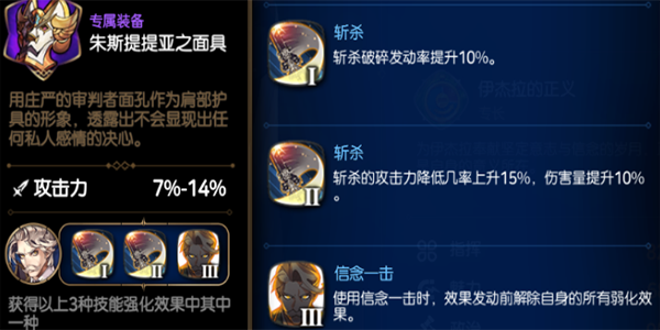 挥舞大剑攻击敌人,有50%的几率在1回合内造成攻击力降低50%。使用技能后,有25%的几率额外使用破碎技能,若目标为强化效果状态时,发生率提升为2倍。