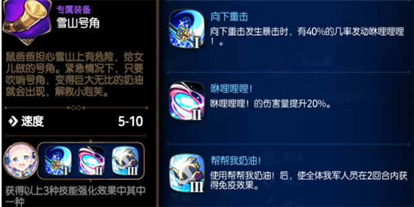 用长矛攻击敌人后,使自身速攻值提升15%。发生重击时,专注获得量提升为2倍,且有40%的几率发动咻哩哩哩!。根据自身最大生命值等比提升伤害量。