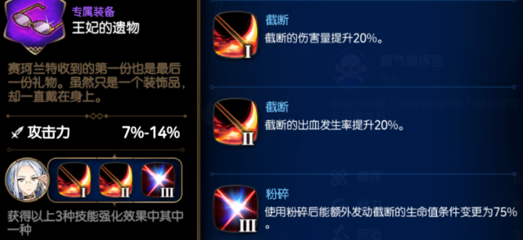 对敌人连续挥舞镰刀进行攻击,各有85%的几率在2回合内造成无法恢复和出血效果。攻击后,若目标的生命值低于50%则额外使用截断。额外攻击时,使截断以100%的几率造成出血效果;