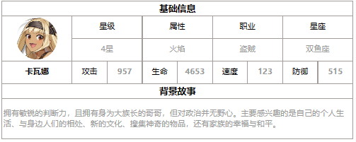 第七史诗是一款十分火爆的手游,其中卡瓦娜是游戏中的四星角色,不少小伙伴想了解该角色,下面小编为大大家带来了四星英雄卡瓦娜的介绍,希望对感兴趣的玩家有所帮助,大家一起来看看吧。