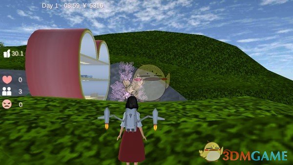 3、继续朝着哦粉红色的建筑飞行,飞到顶之后我们就可以看见爱心小屋的全貌。
