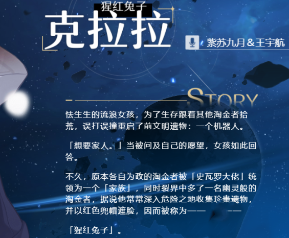克拉拉这个角色在官方的设定中是一个流浪女孩,在机缘巧合之下撞见了前文明古物,也正因如此克拉拉的命运发生了巨大的变化。在此后,克拉拉乐忠于收藏各种古物或是遗物。克拉拉的战斗方式以前文明古物中的巨型机器人为主,属于输出型角色。