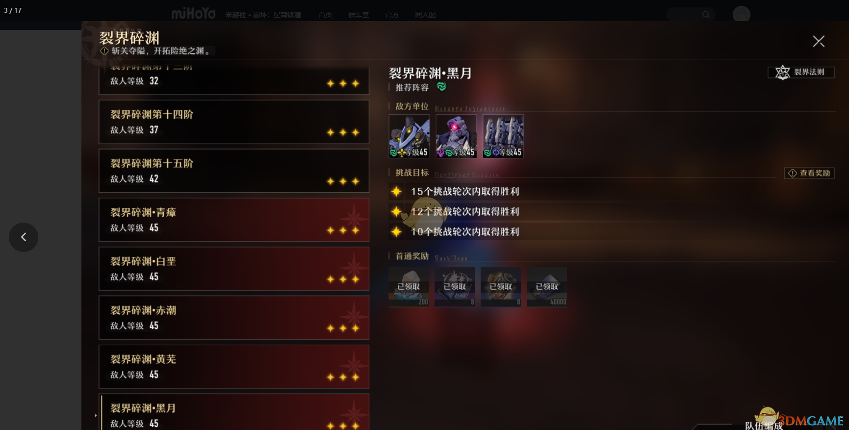 3、第二个机制就是阶段的设定,阶段也就相当于一个层数的设定。随着阶段的提升,里面遇到的怪物实力也是会增加的。在每个阶段的挑战中都是有一个星级通关的设定,玩家要做的就是在对应的回合内获得胜利即可,没有其他的要求,阵亡的话也不会降低星级的。