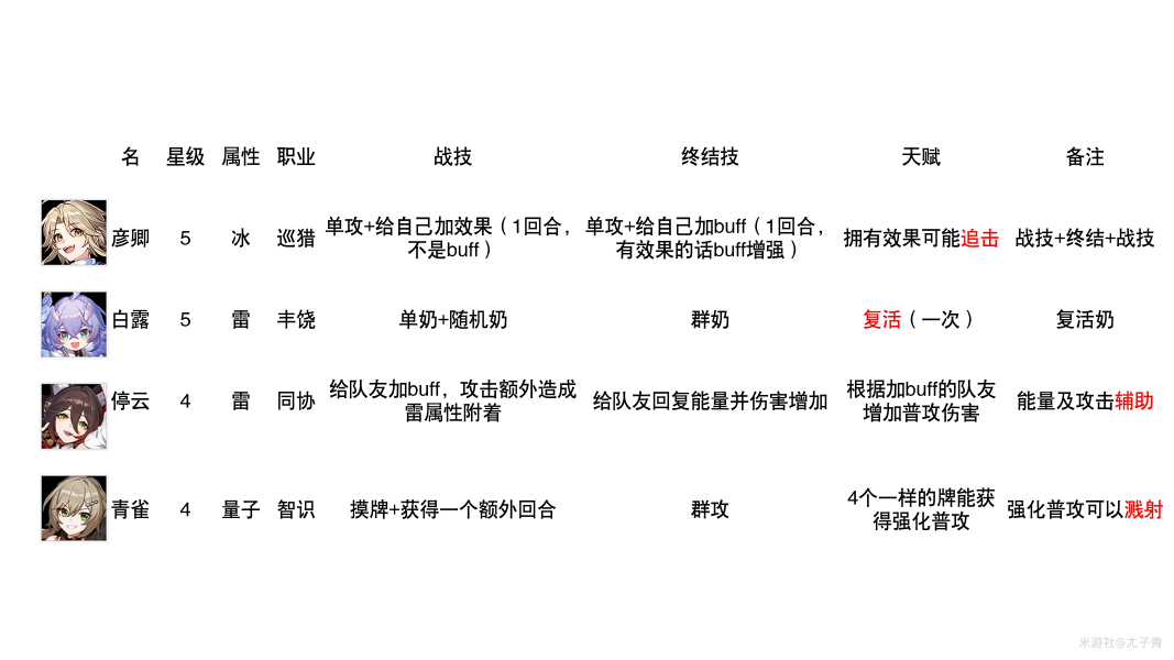 4星,雷系,同协,buff辅助。大招能恢复单人的能量并增加伤害,优秀的单人辅助。