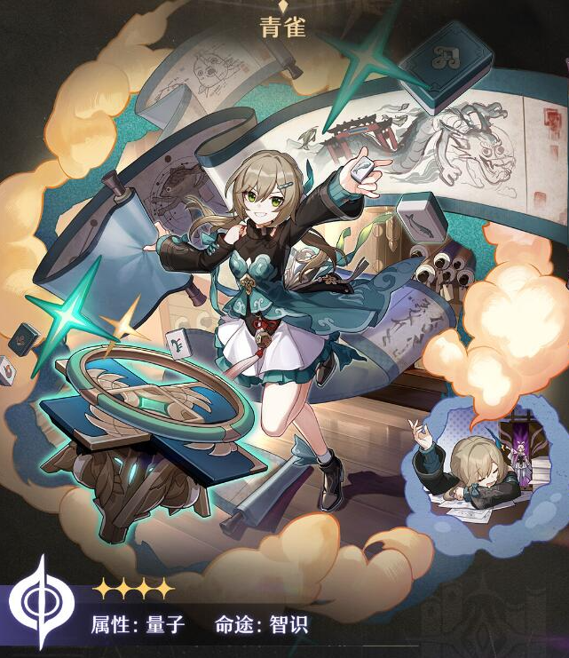 青雀是一名智识命途的量子属性角色,拥有独特的「帝垣琼玉」机制。她抽取琼玉牌,当琼玉牌达到四张同色时,青雀将获得强化普攻并可以对多名敌方造成伤害。