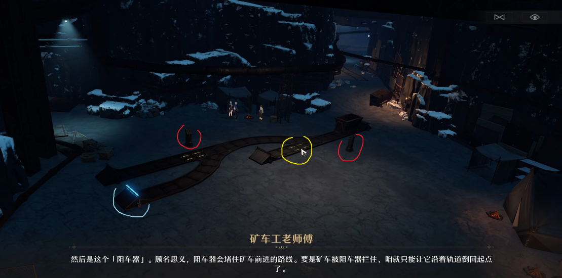 黄色圈中是轨道上的阻车器,矿车需要通过阻车器前进;