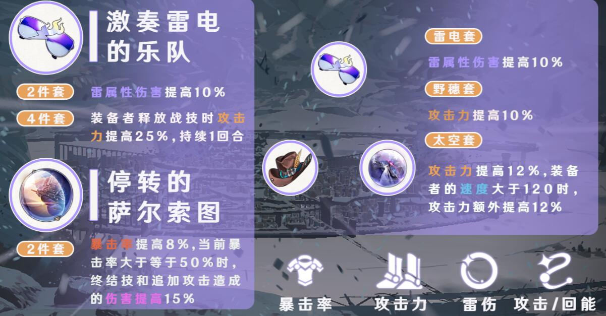 希露瓦遗器的最优选择为【激奏雷电的乐队】四件套与【停转的萨尔索图】二件套,雷电套可以为希露瓦提供雷属性伤害提升与攻击力提升;萨尔索图套可以提升希露瓦的暴击率并为希露瓦的终结技提供增伤,不过需要让希露瓦的暴击率达到50%以上来触发套装效果。