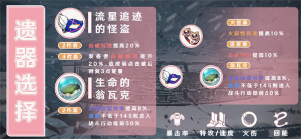 2:遗器的话最佳选择【流星追迹的怪盗】四件套与【生命的翁瓦克】二件套;
